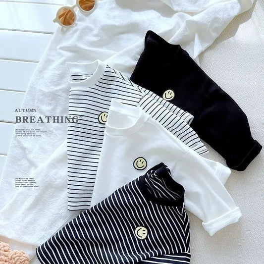 تي شيرت للأطفال بأكمام طويلة، ملابس الربيع المبكر، النسخة الكورية، قميص عصري فضفاض، تصميم جديد للجنسين، بلوزة مخططة بياقة دائرية