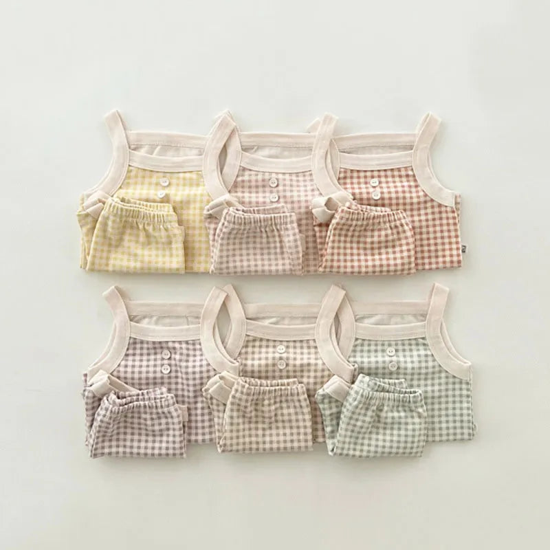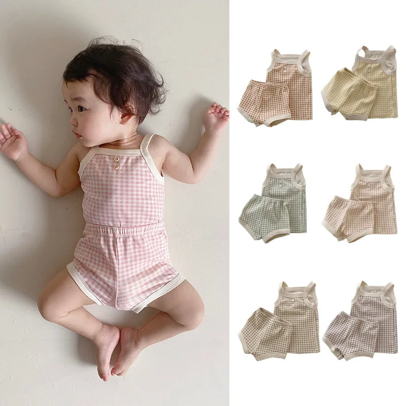 طقم ملابس للأطفال حديثي الولادة من عمر 6 إلى 36 شهرًا، مكون من قطعتين، قميص بدون أكمام، شورت، طقم صيفي بنقشة مربعات، طقم ملابس أطفال مكون من قطعتين