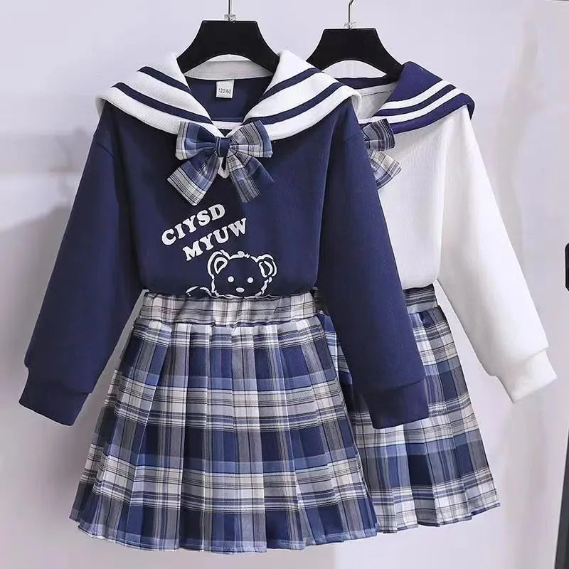 زي مدرسي خريفي للفتيات الصغيرات، سترة برسوم كرتونية لطيفة، تنورة مطوية، ملابس مدرسية ربيعية من 3 إلى 15 سنة